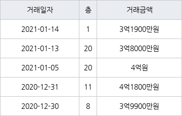 [이 기사는 조선비즈와 아티웰스가 공동으로 개발해 서비스하는 로봇 기사입니다.]국토교통부 실거래가 공개시스템에 따르면 지난 2021년 1월 5일 경기도 수원시 영통구 영통동 영통황골주공1차 20층 전용면적 59㎡형이 4억원에 거래됐다.