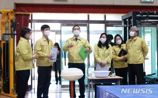 [청주=뉴시스] 인진연 기자 = 정종철 교육부차관이 19일 충북도교육청 중등임용시험 체육 실기시험장인 청주 내수중학교를 방문해 2021학년도 교원임용시험(2차) 실기시험 준비상황을 점검하고 있다. (사진=교육부 제공) 2021.01.19