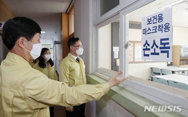 [청주=뉴시스] 인진연 기자 = 정종철 교육부차관이 19일 충북도교육청 중등임용시험 체육 실기시험장인 청주 내수중학교를 방문해 2021학년도 교원임용시험(2차) 실기시험 준비상황을 점검하고 있다. (사진=교육부 제공) 2021.01.19
