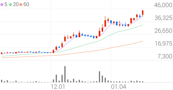전일 대비 14.18% 상승한 45,900원에 거래되고 있다.