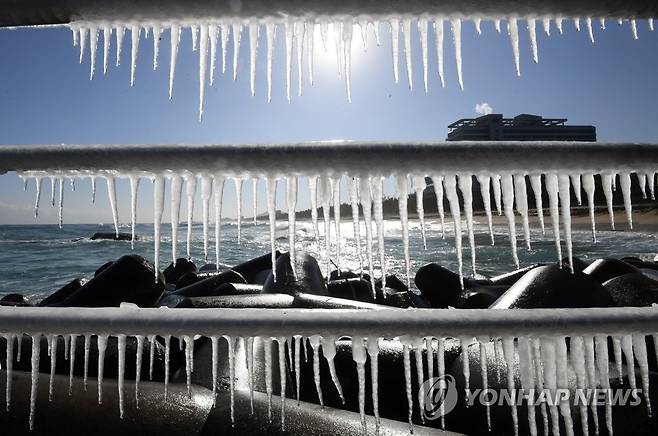 (강릉=연합뉴스) 이해용 기자 = 강원 평창 면온의 기온이 영하 22.1도까지 떨어지는 등 강추위가 몰아친 19일 강원 강릉시의 한 해변 난간에 고드름이 달려 있다. 2021.1.19