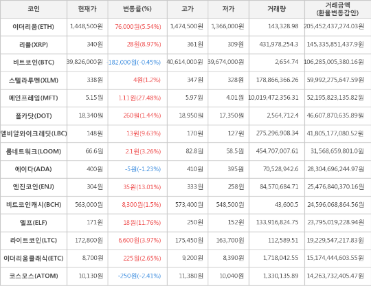 또한, 엔진코인(13.01%, 304원), 엘프(11.76%, 171원), 엘비알와이크레딧(9.63%, 148원), 리플(8.97%, 340원), 이더리움(5.54%, 1,448,500원), 라이트코인(3.97%, 172,800원), 룸네트워크(3.26%, 66.6원), 이더리움클래식(2.65%, 8,700원), 비트코인캐시(1.5%, 563,000원), 폴카닷(1.44%, 18,340원), 스텔라루멘(1.2%, 338원)이 상승세를 나타냈다.
