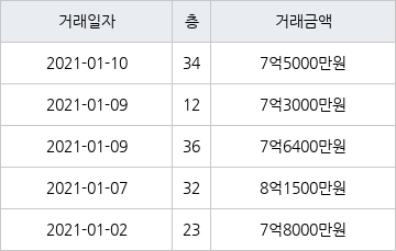 국토교통부 실거래가 공개시스템에 따르면 지난 2021년 1월 9일 인천광역시 연수구 송도동 e편한세상송도아파트 36층 전용면적 84㎡형이 7억6400만원에 거래됐다. 지난 2021년 1월 10일 같은 면적형인 34층 물건이 7억5000만원에 실거래된 것과 비교해 1400만원 높은 가격이다.