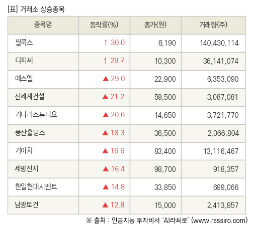 [fnRASSI]장마감, 거래소 상승 종목(필룩스 30.0% ↑)