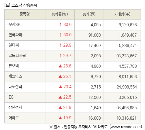[fnRASSI]장마감, 코스닥 상승 종목(무림SP 30.0% ↑)