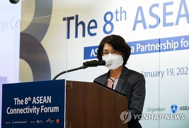 (서울=연합뉴스) 롬마니 카나누락 주한태국대사가 19일 서울 웨스틴 조선호텔에서 열린 '제8차 아세안 연계성 포럼'에서 축사하고 있다. 2021.1.19