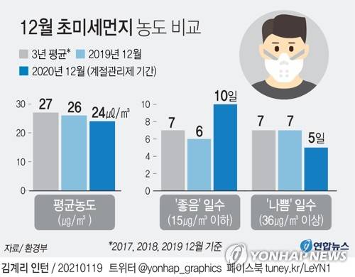 (서울=연합뉴스) 김영은 기자 = 제2차 미세먼지 계절관리제 시행 첫 달인 지난해 12월 초미세먼지 등 대기오염물질이 정부의 정책 효과 등으로 전반적으로 개선된 것으로 나타났다.
