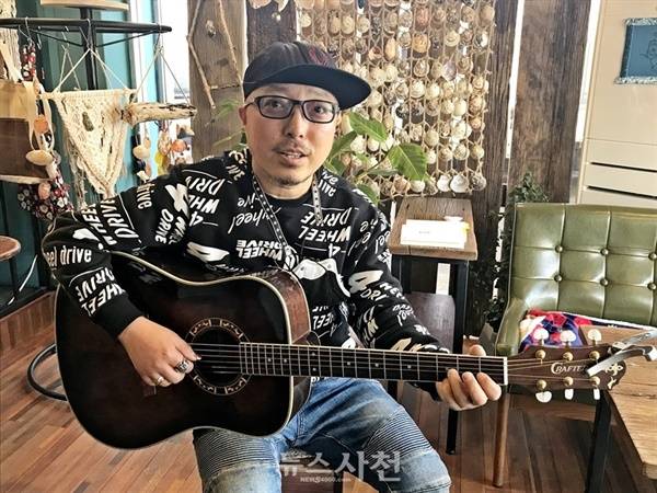 | ▲ 박재범 씨는 사천에서 음악을 하면서 행복을 많이 느낀다고 말했다. 사진은 박 씨가 기타를 연주하는 모습. |