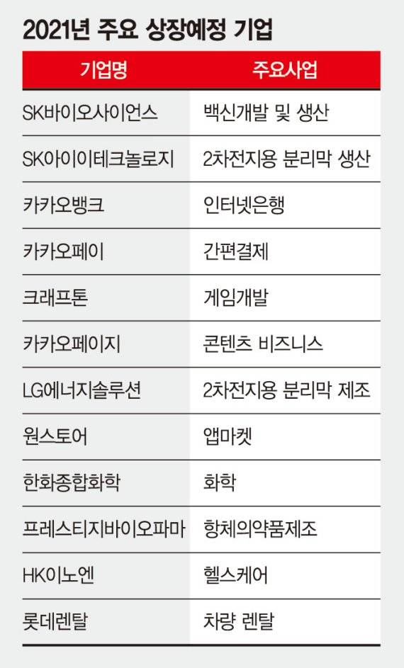 통상 연초는 IPO 시장 비수기로 알려져 있지만 올해는 사정이 다르다. 증시 상승세가 이어지고 있어 개인은 물론 기관까지 물량 확보에 혈안이다. 예비 상장사 입장에서도 올해 SK바이오사이언스, 카카오뱅크, 크래프톤, 롯데렌탈 등 조 단위 대어급 회사들이 상장을 앞둔 만큼 이들과의 경쟁을 피하고 시황이 좋을 때 자금확보에 나서야 한다.
