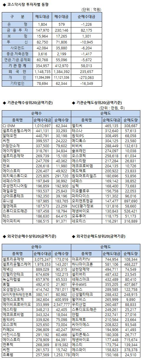 [표]코스닥 기관/외국인 매매동향(1/19 3시30분)