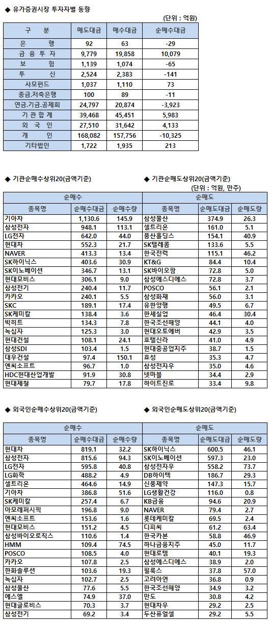 [표]코스피 기관/외국인 매매동향(1/19 3시30분)