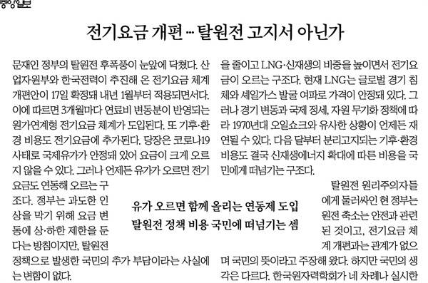 | ▲ 전기요금 인상 주장하며 탈원전 정책을 원인으로 지적한 중앙일보 사설 |