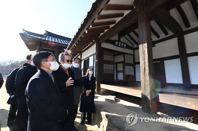 (서울=연합뉴스) 19일 오후 김현모 문화재청장(왼쪽)이 충북 옥천 이지당을 방문해 현장을 둘러보고 있다. 2021.1.19