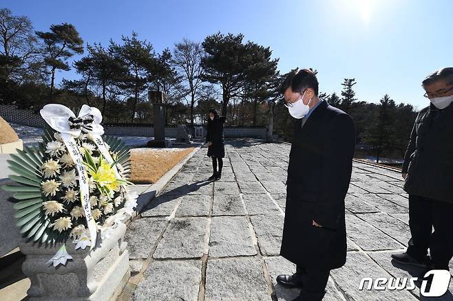 (서울=뉴스1) = 김현모 문화재청장이 19일 오후 코로나19 대응상황 점검 차 칠백의총을 방문, 참배하고 있다.
