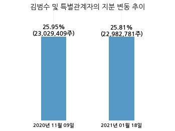 카카오는 김범수 및 특별관계자의 지분율이 25.95%에서 25.81%로 변동했다고 19일 공시했다.