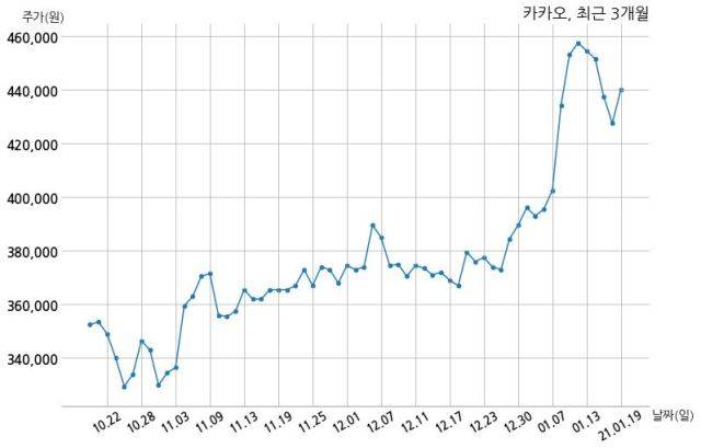 한편, 카카오는 장 마감 이후 해당 기업공시를 발표했으며 오늘 종가가 440,000원, 거래량은 580,280주로, 직전 거래일 대비 12,500원(+2.92%) 상승했다.