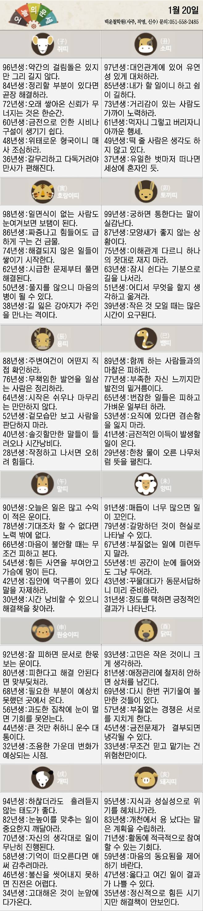 [재미로 보는 오늘의 운세] 1월 20일 (수요일)