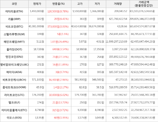 또한, 메인프레임(26.49%, 5.11원), 엘프(13.73%, 174원), 엘비알와이크레딧(11.85%, 151원), 이더리움(8.78%, 1,493,000원), 리플(6.41%, 332원), 라이트코인(6.02%, 176,200원), 이더리움클래식(3.72%, 8,790원), 폴카닷(3.54%, 18,720원), 비트코인캐시(2.96%, 571,100원), 룸네트워크(2.17%, 65.9원), 이오스(1.95%, 3,135원), 스텔라루멘(1.5%, 339원), 에이다(0.74%, 408원)가 상승세를 나타냈다.