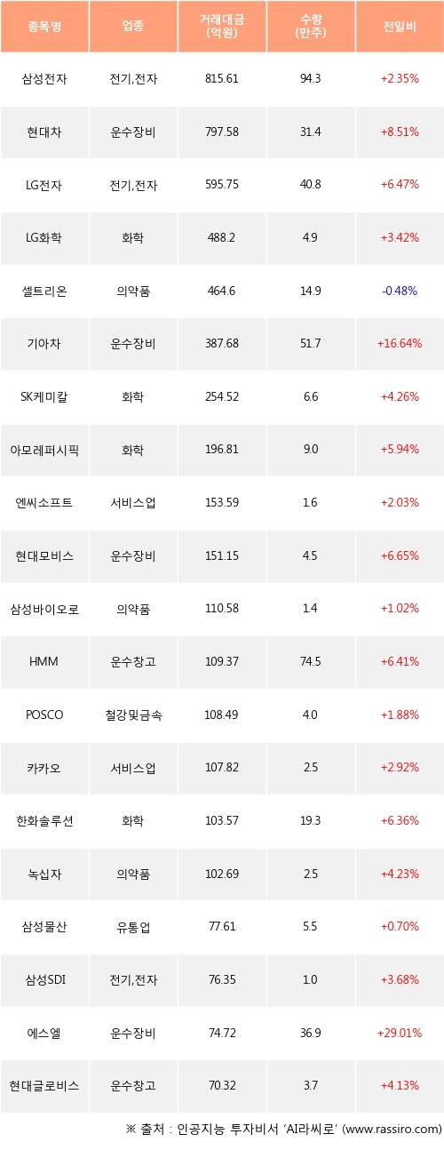 삼성전자, 현대차, LG전자 등은 전일 대비 주가가 상승했고, 셀트리온 등은 주가가 하락했다.