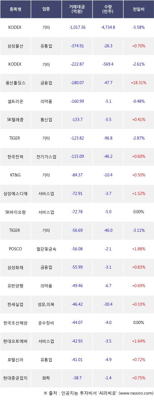 19일, 거래소 기관 순매도상위에 서비스업 업종 3종목