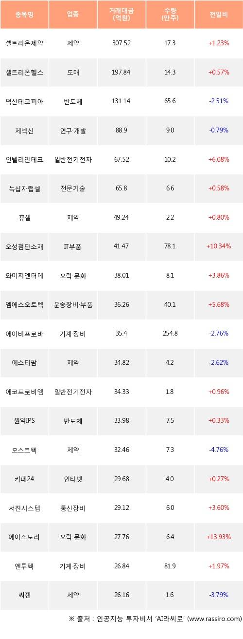 외국인 투자자의 순매수 상위 20개 종목은 셀트리온제약, 셀트리온헬스케어, 덕산테코피아, 제넥신, 인텔리안테크, 녹십자랩셀, 휴젤, 오성첨단소재, 와이지엔터테인먼트, 엠에스오토텍등이다.