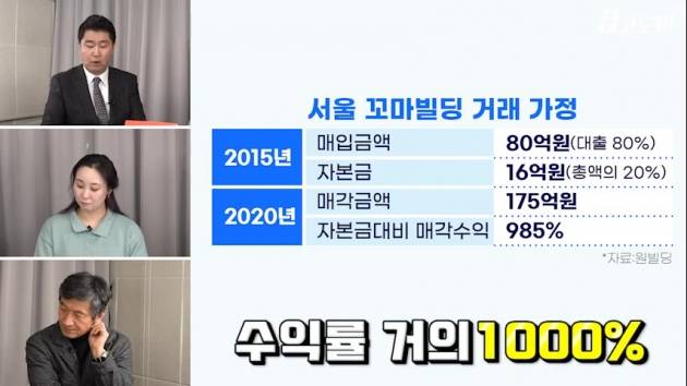 이런 상상을 해본거죠. 2015년 8조를 80억이라고 보자. 그때 당시 2015년도 본인의 자금이 20%가 있으면 살 수 있었어요. 80억 짜리 건물 사려면 16억 정도만 있으면 샀죠. 80억을 16억에 산다고 가정하면, 주식 전체 합산되는 거랑 똑같이 본다고 하면 이게 8조가 17조 5천억이 된거잖아요. 그러면 내가 투자한 금액 2015년 80억을 16억에 투자했고 그 건물이 5년만에 175억이 된거죠. 0을 다 뺀거죠. 이분이 175억에 샀고 그때 당시 16억원에 샀으니 수익률이 거의 1000%가 되는 거에요. 985%가 되거든요. 그러니까 투자하시는 분들은 이런 것들을 보고 꼬마빌딩이나 건물에 투자하시는 거에요. 아파트에서 보면 갭투자 같은 것 서서히 대출규제가 생기면서 예전만한 수익률은 내고있지 않지많은 빌딩시장에 대한 이면을 이해하기 위해서는 이렇게 숫자를 줄여서 판단해보면 어떨까 해서 만들어봤습니다.