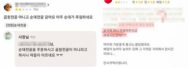 음식점주의 잘못이 아님에도 음식점에 나쁜 평가를 남기는 소비자들도 빈번하다. ‘순대전골’을 주문한 뒤 “곱창전골이 아니라 순대전골 같다”며 별점 2개를 메긴다. 주문 시 요청 사항에 ‘스푼 필요 없음’으로 체크했음에도 “숟가락을 안 넣었다. 황당하다”는 평가를 남긴다.