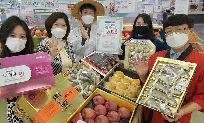 | “설 선물은 우리 농축수산물로 하세요” 정부가 국무회의에서 설 명절 농축수산 선물 가액을 기존 10만원에서 20만원으로 상향하는 청탁금지법 시행령 개정안을 의결한 19일 서울 서초구의 농협 하나로마트 양재점에서 직원들이 다양한 설 선물세트를 소개하고 있다. 농협유통 제공 |
