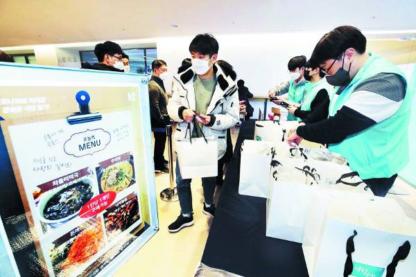 KT 임직원들이 19일 서울 광화문 KT 사옥에서 밀키트를 판매하고 있다. KT는 골목상권 지원을 위해 광화문 인근 식당에서 만든 밀키트를 다음 달 2일까지 판매한다. 뉴시스