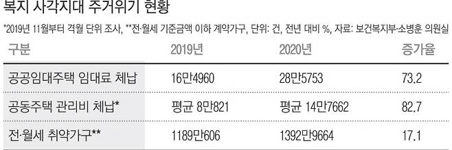 지난해 임대료를 체납한 공공임대주택 거주자가 전년보다 70% 넘게 급증했다. 관리비를 제때 내지 못한 가구나 임대료 체납 위험이 큰 ‘전·월세 취약가구’도 크게 늘었다. 코로나19가 장기화되면서 주거위기에 내몰리는 가구가 큰 폭 늘었다는 의미로 풀이된다.