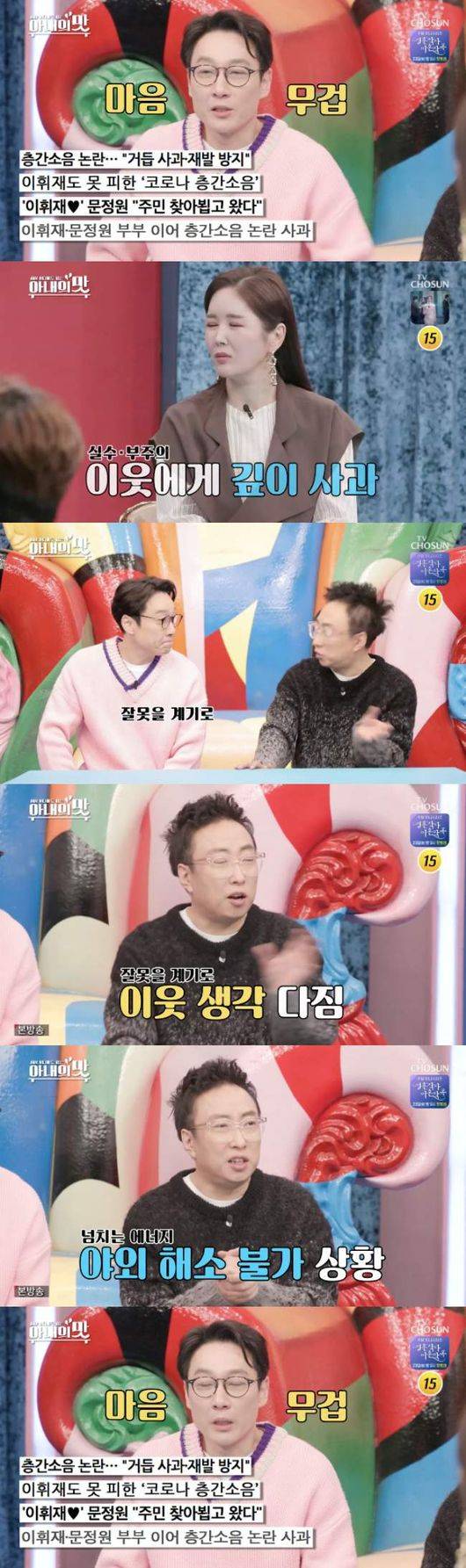 19일 오후 방송된 종합편성채널 TV조선 예능프로그램 ‘아내의 맛’에서 패널들은 오프닝부터 이휘재 가족을 걱정했다. 최근 불거졌던 층간 소음 논란에 대해서 언급한 것.