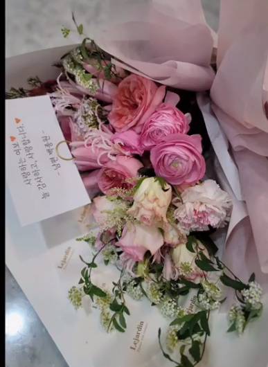 꽃다발에는 “사랑하는 여보♥ 늘 감사하고 사랑합니다 ♥ 남편 백종원”이라는 글이 적혀있다.