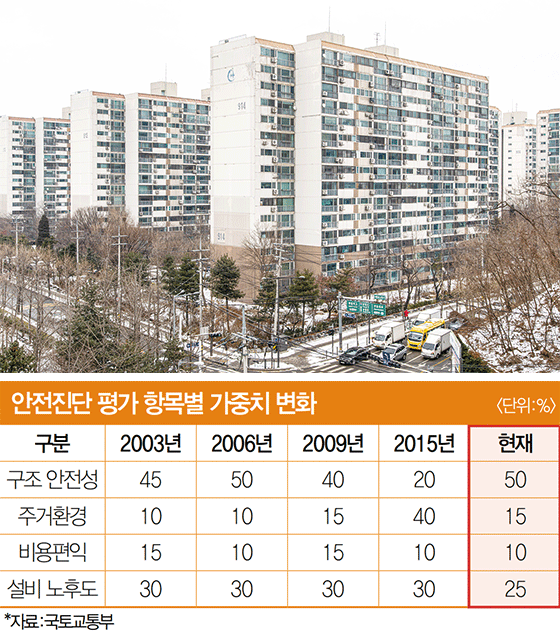 정밀안전진단 단계에서는 ▲구조 안전성(50%) ▲주거환경(15%) ▲비용편익(10%) ▲설비 노후도(25%) 등 항목별로 구체적으로 나눠 평가한다. 여기서 E등급(30점 이하)을 받으면 즉시 재건축이 가능하고, 재건축 이전보다 경제성이 없다고 판단되면 D등급(31~55점)을 받고 리모델링이나 조건부 재건축이 가능하다. A~C등급을 받으면 아직 건물이 안전하다고 판단해 재건축을 진행할 수 없다.