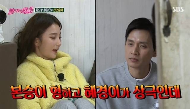 이어 최창민은 “상극이라고 하는 건, 봄과 가을. 여름과 겨울”이라고 설명했고, 최민용은 “본승이 형하고 혜경이가 상극인데 어떻게 해야 하냐”고 질문했다. 구본승은 “그걸 왜 네가 물어봐”라며 민망해 했고, 최창민은 “가끔 보면 된다. 가끔 보면 더 애틋하다”고 답했다. (사진=SBS ‘불타는 청춘’ 캡처)
