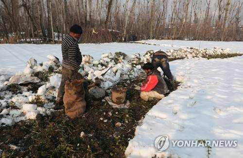 epa08948576 Kasjhmiri men harvest radish from a snow covered field in Srinagar, the summer capital of Indian Kashmir, 19 January 2021. Kashmir is in a grip of cold wave with days witnessing sunshine and nights sub-zero temperatures. EPA/FAROOQ KHAN