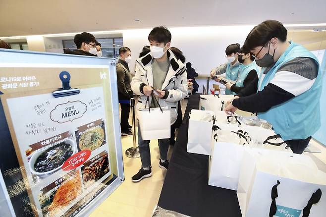 KT는 코로나19 장기화로 어려움을 겪는 서울 광화문 골목상권을 돕기 위해 식당에서 만든 밀키트(간편조리식)를 KT 광화문 사옥에서 판매한다고 19일 밝혔다. KT 임직원들이 밀키트를 구매하고 있다.