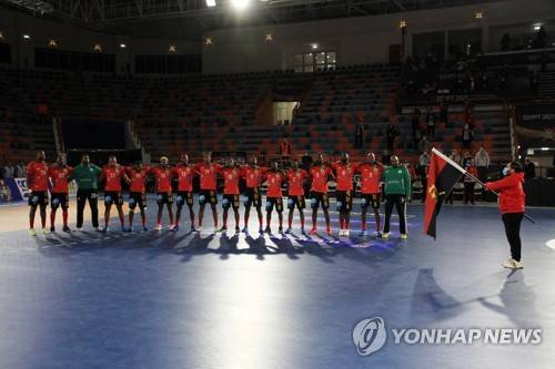 epa08948687 A handout photo made available by Egypt Handball 2021 of the team of Angola listen to the national anthem before the match between Japan and Angola at the 27th Men's Handball World Championship in Alexandria, Egypt, 19 January 2021. EPA/Hazem Gouda / Egypt Handball 2021 HANDOUT HANDOUT EDITORIAL USE ONLY/NO SALES