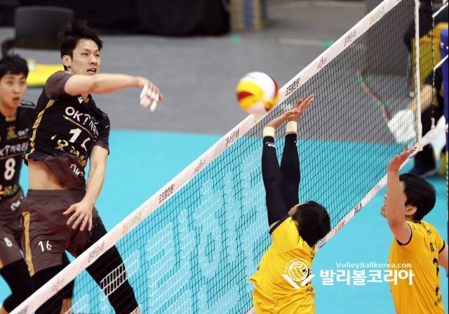 【발리볼코리아닷컴(의정부)=김경수 기자】 19일(화) 경기도 의정부시 의정부체육관에서 열린 프로배구 2020-2021 V리그 4라운드 남자부 KB손해보험 vs OK금융그룹 의정부경기에서 OK금융그룹 진상헌의 속공공격을 KB손해보험 구도현이 블로킹하고 있다. 2021. 1.19.