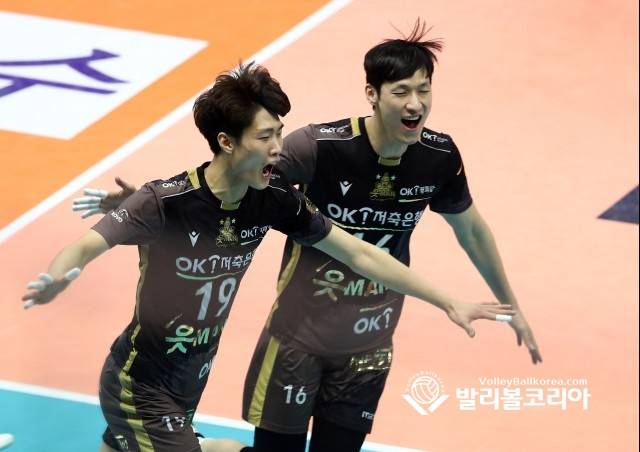 【발리볼코리아닷컴(의정부)=김경수 기자】 19일(화) 경기도 의정부시 의정부체육관에서 열린 프로배구 2020-2021 V리그 4라운드 남자부 KB손해보험 vs OK금융그룹 의정부경기에서 OK금융그룹 박창성과 진상헌이 KB손해보험 공격을 블로킹 시키고 기뻐하고 있다. 2021. 1.19.