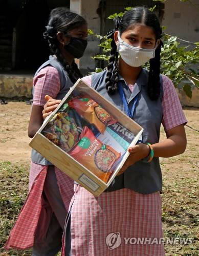 epa08948739 Indian students receive gift boxes from non-government organistations at Government High School in Thulasendrapuram village, south of Chennai, Tamil Nadu, India, 19 January 2021. Villagers gathered at Kamala Harris's Indian ancestral village Thulasendrapuram to pray and celebrate for her success ahead of Biden's inauguration ceremony to host Joe Biden as 46th US president and Kamala Harris as vice president. EPA/JAGADEESH NV