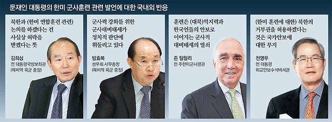 존 틸럴리 전 주한미군사령관은 이날 동아일보에 보낸 이메일에서 문 대통령의 발언에 대해 “(한미 연합)훈련은 (대북) 억지력과 한국인들의 안보로 이어지는 군사적 대비태세의 열쇠”라고 강조했다. 한미 연합훈련이 한국인들의 안전에 필수적인 만큼 한국 정부가 북한과 협의를 통해 중단할 성격이 아니라는 점을 시사한 것이다. 천영우 전 대통령외교안보수석비서관은 이날 페이스북에 “북한의 핵미사일 공격과 남침을 막아낼 훈련을 할 것인지를 공격 주체와 협의할 어젠다로 삼는다는 것 자체가 자해적 발상”이라며 “북한의 위협으로부터 지키는 문제를 민족 공조의 대상으로 삼겠다는 것은 국군 통수권자가 제정신으론 할 수 없는 일이다. 국가안보에 대한 무지와 무책임의 극치”라고 비판했다. 노무현 정부에서 대통령국방보좌관을 지낸 김희상 한국안보문제연구소 이사장(예비역 중장)은 “(북한에) 허락을 받겠다는 뜻 아니냐”며 “북핵 억제를 위한 연합훈련을 북한과 논의하겠다는 것 자체를 미국이 수용하지 않을 것”이라고 지적했다.