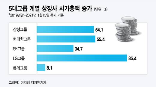 19일 금융투자업계에 따르면 지난 15일 종가 기준 롯데그룹 시가총액은 2019년 말에 비해 8% 증가했다. 4대 그룹의 시가총액이 같은기간 35~85% 가량, 코스피지수도 40% 상승한 것을 감안하면 상대적으로 초라한 수준이다. 그나마 업황 회복에 대한 기대감으로 반등한 롯데케미칼, 롯데정밀화학 등 화학 계열사를 제외하면 7.8% 하락했다. 그룹 핵심 사업부문인 유통부문은 시장에서 철저히 외면 당한 셈이다.