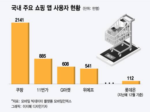 이후 롯데 통합온라인몰 롯데온은 지난해 4월에야 출범했다. 2년간 총 3조원을 투자해 만든 온라인몰 성적은 처참하다. 모바일 빅데이터 플랫폼 모바일인덱스에 따르면 지난해 12월 기준 롯데온 애플리케이션 월 사용자수는 112만명으로 1위 쿠팡(2141만명)의 5.2% 수준에 불과하다. 지난해 3분기까지 롯데온이 포함된 롯데쇼핑 기타 사업부문 매출액은 전년동기대비 55.6% 감소한 4280억원, 영업적자는 2180억원으로 불었다.