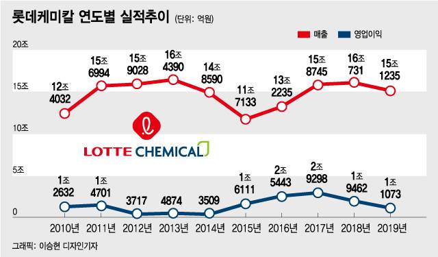 롯데케미칼은 한 해 약 15조원대(2019년 기준)의 매출을 올리며 롯데쇼핑(약 18조원)과 함께 그룹의 실적 두 축을 담당하는 주요 계열사다. 지난해 영업이익은 1조1000억원대로 롯데쇼핑(4300억원)의 두 배 이상으로 그룹 내 사실상 '캐시카우' 역할을 했다.