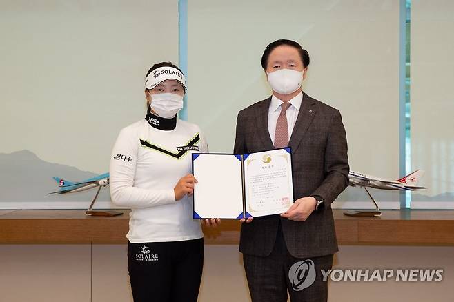 (서울=연합뉴스) 지난 19일 서울 강서구 대한항공 본사에서 우기홍 대한항공 사장과 프로골퍼 고진영 선수가 '엑설런스 프로그램 후원 협약'을 체결한 후 기념 촬영을 하고 있다. 2021.1.20