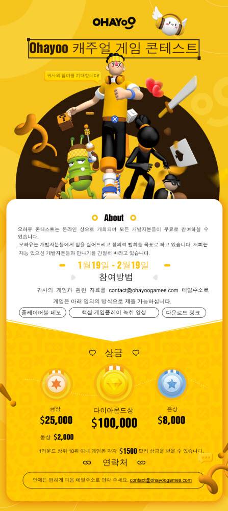 양사는 한-중 양국 게임업체 교류와 소통을 꾀할 계획이다. 또 내달 19일까지 하이퍼캐주얼에서 미드코어 캐주얼까지 모든 캐주얼 장르 작품을 대상으로 '오하유 캐주얼게임 개발자 콘테스트'를 진행한다. 10개 우수작을 선정해 각 1500달러씩 지급한다. 최종 선정작은 중국 또는 기타 글로벌 지역에 출시할 수 있도록 지원을 받을 수 있다.