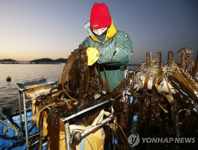 (태안=연합뉴스) 20일 충남 태안군 소원면 파도리 앞바다에서 한 어민이 곰피를 채취하고 있다. 다시마목 미역과 해조류인 곰피는 풍부한 점액 성분을 갖고 있어 호흡기 속으로 들어온 미세먼지를 몸 밖으로 배출하는 데 효능이 있는 것으로 알려졌다. 2021.1.20 [태안군 제공. 재판매 및 DB 금지]