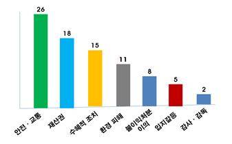□ 지난해 조정・합의로 해결한 85건의 민원을 분야별로 살펴보면, 안전・교통 26건, 재산권 관련 18건, 수혜적 조치 15건, 환경피해 11건, 불이익처분 이의 8건, 입지갈등(NIMBY) 5건, 감사・감독 2건 등이다.