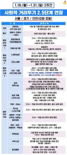 주요 내용으로는 현 사회적 거리두기 2.5단계를 31일까지 연장 적용하되 연말연시 특별대책 핵심 조치를 포함하고 집합 금지 시설 등에 대한 방역 조치를 일부 추가 보완했다.