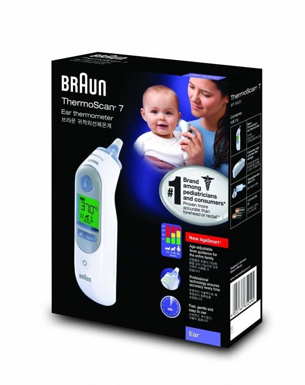 정확한 체온 측정을 위해서는 귀적외선체온계를 권장한다. 측정 결과치에 대한 신뢰도가 높아서다. 브라운 써모스캔(Thermoscan, IRT6520)은 정확한 체온 측정은 물론, 신생아부터 유아, 성인까지 연령별로 발열 정도를 표시하는 게 가능하다. 특허 받은 에이지스마트 기능은 측정 대상자의 연령에 따라 발열 정도를 초록색, 노란색, 빨간색으로 구분해 화면에 보여준다. 엄마는 이를 통해 손쉽게 아이의 발열 정도를 확인할 수 있다.